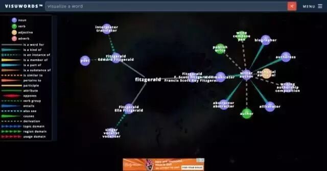 输入一个你要写的essay的keyword,例如Fitzgerald,然后神奇的事情发生了,Visuwords开始动脑帮你按树状的模式联想和扩展出更多的关键词,并标明它们之间的关系。